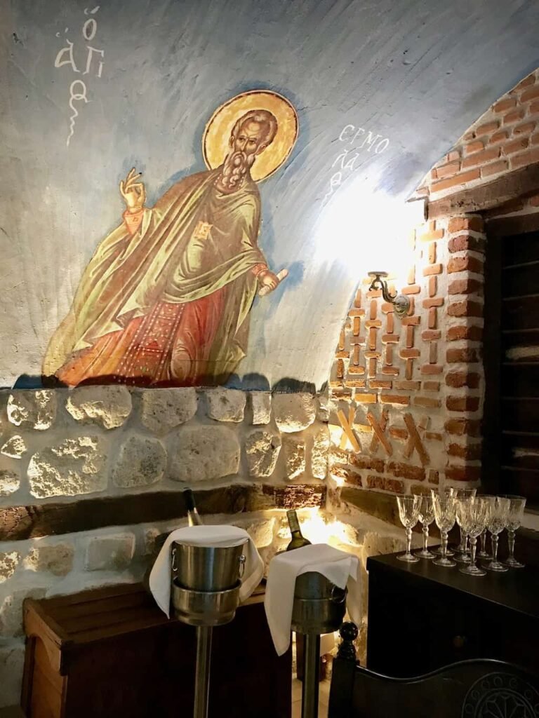 The restaurant’s name, Hierion, means sacred place or temple. One of several small Byzantine sanctuaries on the property in Halkidiki, this little stone marvel made for a very special dining experience. Only big enough for two long tables, it is exclusive without feeling snobbish. I could envision it as a refectory- a monk’s dining area, perhaps a little on the lavish side. Water flowing from a historical water fountain and warm candlelight complete the transportation to a different age of a different world…